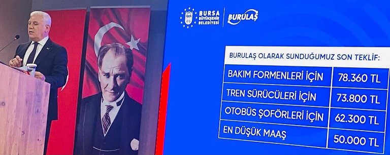 Biz bu talepleri yerine getirirsek, BURSARAY ulaşım fiyatları kısa mesafede 56, uzun mesafede 64 lira yapmak zorunda kalırız. Belediye olarak Bursalılara daha uygun ulaşım hizmeti vermek için her ay BURULAŞ’a 250-350 bin civarında destek veriyoruz. Yani verilen bu teklif Bursa halkına ciddi bir yük getirecektir. Ben kamu görevlisiyim. Bizler her kaynağı israf etmeden verimli kullanmakla yükümlüyüz. Bu süreçte yapıcı bir tutumla, emekten ve haktan yana bir tavırla en düşük 50 bin lira olmak üzere bir maaş teklifi sunduk. Kabul etmedikleri gibi sendika başkanının BURULAŞ’ı yakmakla ilgili sözleri beni çok üzmüştür. Bu sözü tüm Bursalılara o kurumu bu hale getiren değerli insanlara hakaret olarak görüyor, kırıldığımı ve söylenmemiş kabul etmek istediğimi ifade etmek istiyorum” şeklinde kamuoyunu aydınlatıyordu düzenlediği basın toplantısında…